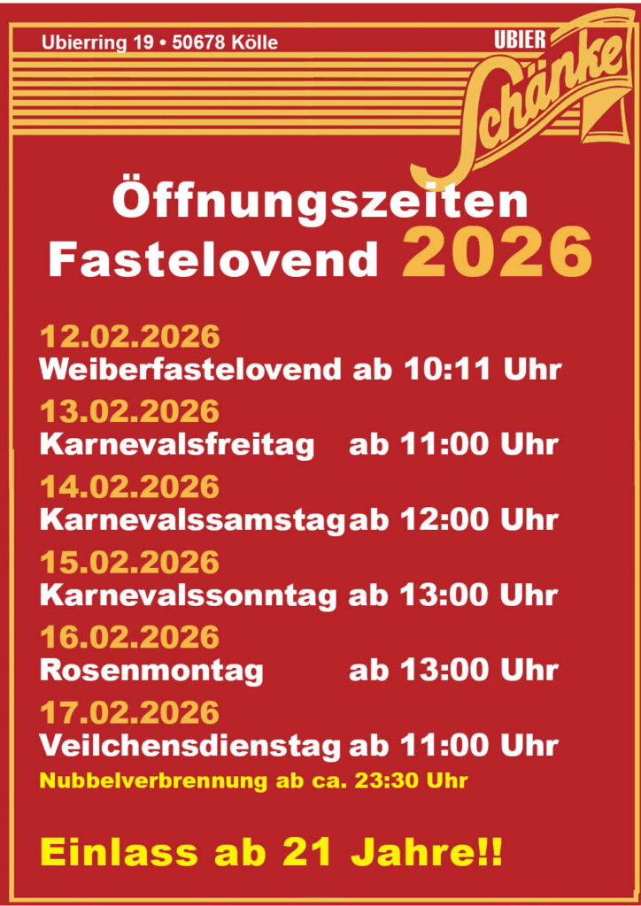 Ein weiteres Highlight in der Uberschänke (liebevoll auch „die Schänke“ genannt) ist der Kölner Karneval. Während der sog. „tollen Tage“ ist die Ubierschänke Anziehungspunkt für Kölsche und Gäste aus aller Welt. In de Ubierschänke ist der Karneval noch ursprünglich. Der Ballermann hat in der Ubierschänke keine Chance.